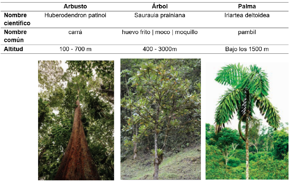 En la Figura 2 se presenta la principal vegetación de los bosques montanos del noroccidente de Pichincha – Ecuador. Los bosques montanos presentan una variedad en arbustos, árboles, palmas, entre otros, que aportan a la capacidad de infiltración del suelo del bosque.